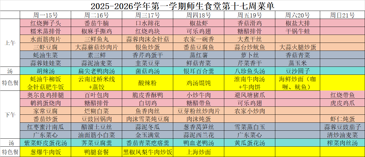 2025-2026学年第一学期师生食堂第十七周菜单