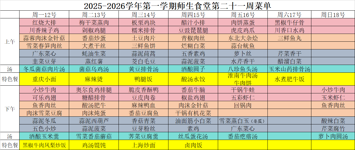 2025-2026学年第一学期师生食堂第二十一周菜单